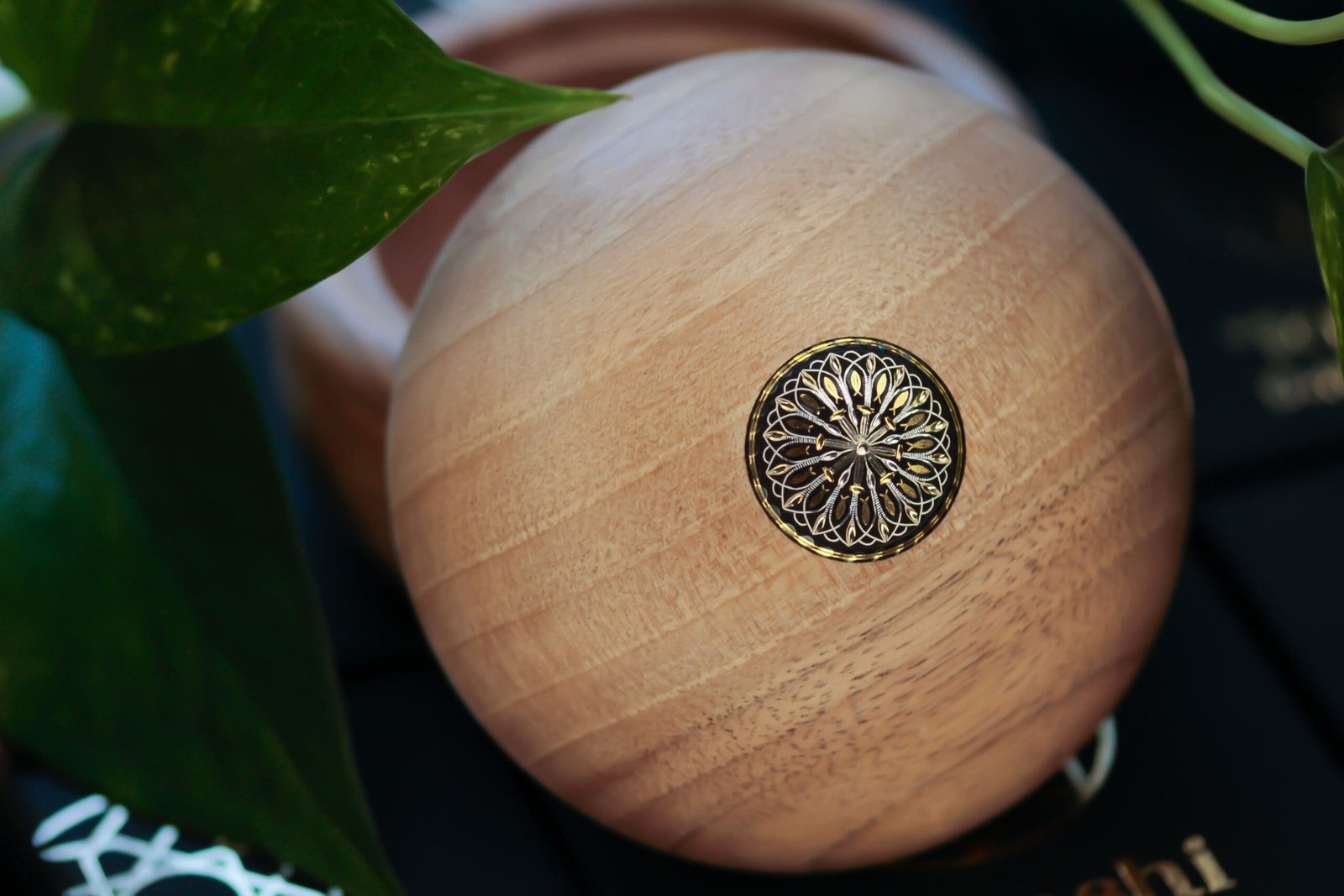 Gold and silver petals unfold over the walnut wood, creating an exuberant chrysanthemum that seems to come to life with the light.