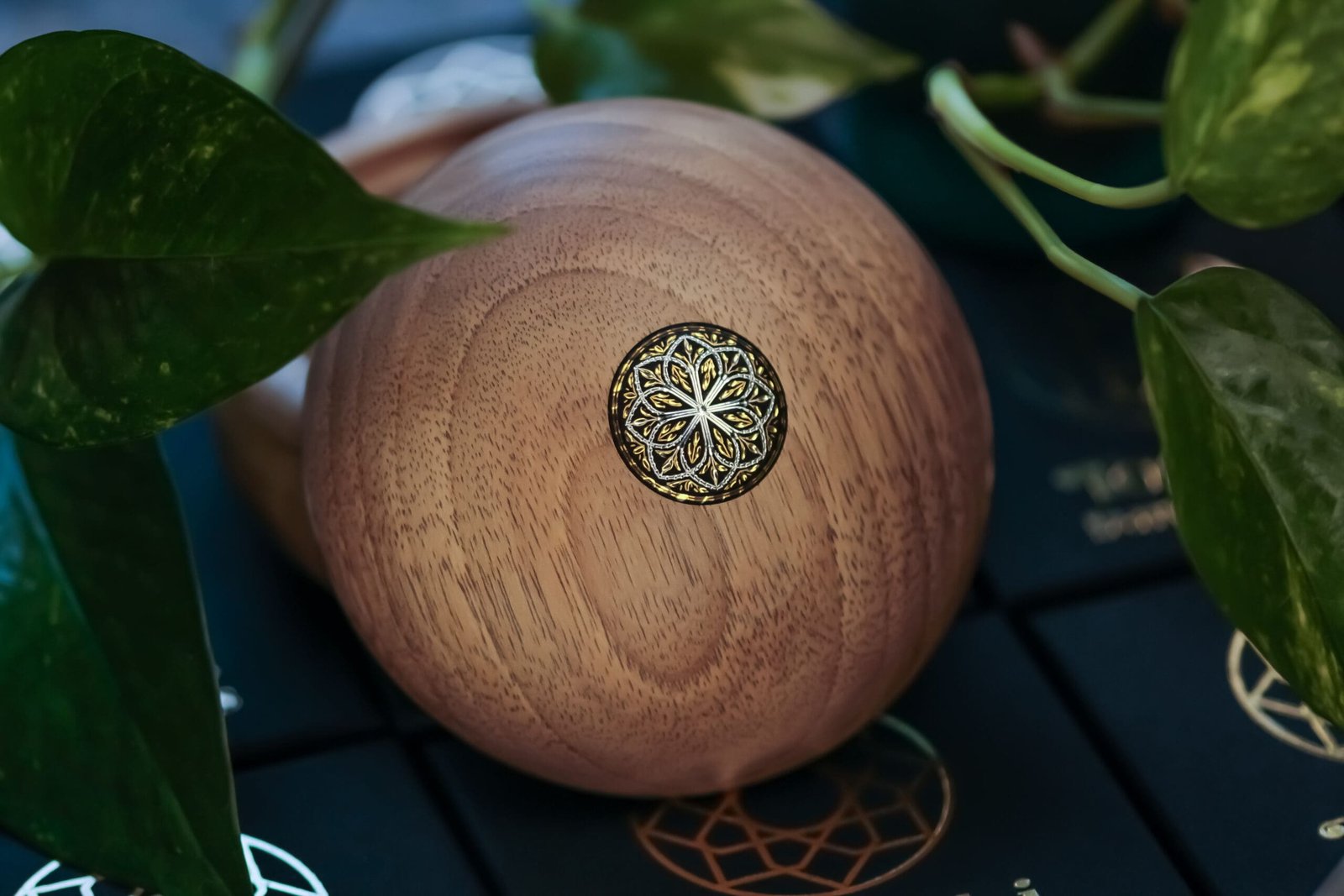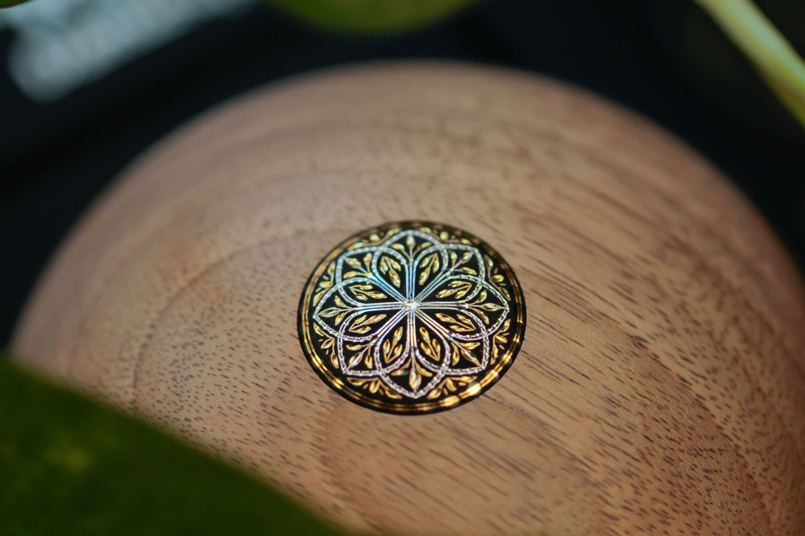 Un intrincado loto en oro y plata se abre en el centro de la tapa de nogal. Simboliza la pureza y el renacimiento, ideal para nuevos comienzos. Tamaño: 10 x 7 cm / tamaño damasquinado: 24 mm de diámetro.
